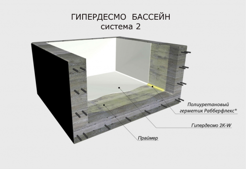 - Основной гидроизоляционный слой - гидроизоляционная полиуретановая мастика Гипердесмо 2КВ. Гидроизоляционная полиуретановая мастика HYPERDESMO-2K-W (Гипердесмо-2К-В) наносится в два слоя на вертикальные поверхности с расходом 0,7 кг/кв.м на один слой и в один слой на горизонтальную поверхность (дно) с расходом 1,4 кг/кв.м.